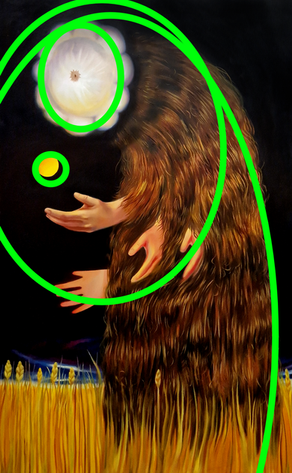 K významu díla AI popis říká: „Scéna vyjadřuje surrealistickou kroucenost a introspekci, což naznačuje symbolické spojení mezi postavou, sluncem a pozicí“, což je opět velmi obecné. Proto bych ráda uvedla svou interpretaci: Scéna znázorňuje energii, kterou se snaží osoba chytit. Energie velmi intenzivní. Obraz vyjadřuje snahu o implementaci něčeho, co nás může přesáhnout, nebo zničit. Snaha dotknout se Slunce. To vše je kompozičně vyjádřeno kruhem (implementace, sjednocení), skrz který ale pronikají diagonály paprsků (kruh je protnut zevnitř). Sluneční paprsky protínají kruhovou kompozici, ale zároveň fyzicky pronikají tělem člověka, zanechávají rány (čemuž AI věnovala překvapivě málo pozornosti). V tento moment jeden paprsek směřuje i k oku a hrozí jeho protnutím. Co se na první pohled jevilo jako harmonická kompozice, se stává bojem s dynamickou energií. Pokud obraz nakloníme o 90 stupňů, všimneme si, že oko slunce a osoby tvoří dvojici, jsou ve stejné linii – dvě oči hledí přímo na diváka. Paprsek zasahující do rohu obrazu je ulomený – slunce nepřesahuje rámec světa, ve kterém existuje.